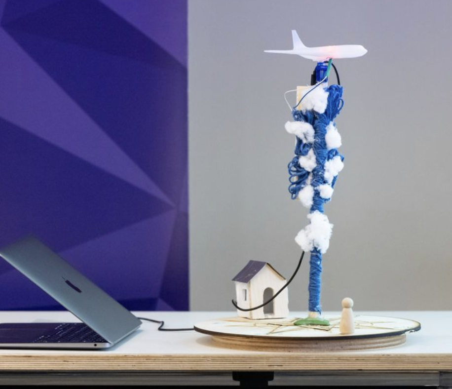 What I Made: 3D-printed airplane mounted on a vertical axis. Servo motor + LED light to animate the plane and highlight direction. Spiral structure with cotton clouds to evoke motion and atmosphere. Compass-inspired base pointing northwest, symbolizing my path to Northwestern.